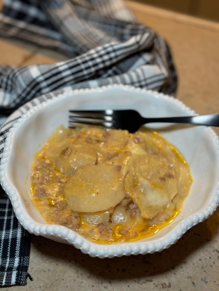 Brown the beef. Don’t skip this part—it adds flavor and keeps everything from going mushy. You’ll want it fully cooked before it heads into the slow cooker. Slice the potatoes thin. Think scalloped-style. A mandolin works great, but a sharp knife does the trick too. Mix your creamy layer. A couple cans of cream of chicken soup, a splash of milk, salt, pepper, and a little garlic powder go a long way. Layer it up. Like lasagna, but way easier. Potatoes, beef, creamy soup mixture, shredded cheese… repeat. Top it all off with a generous sprinkle of cheese. Cover and cook. Low and slow for about 5 hours until the potatoes are fork-tender and everything is melty, bubbly, and irresistible.