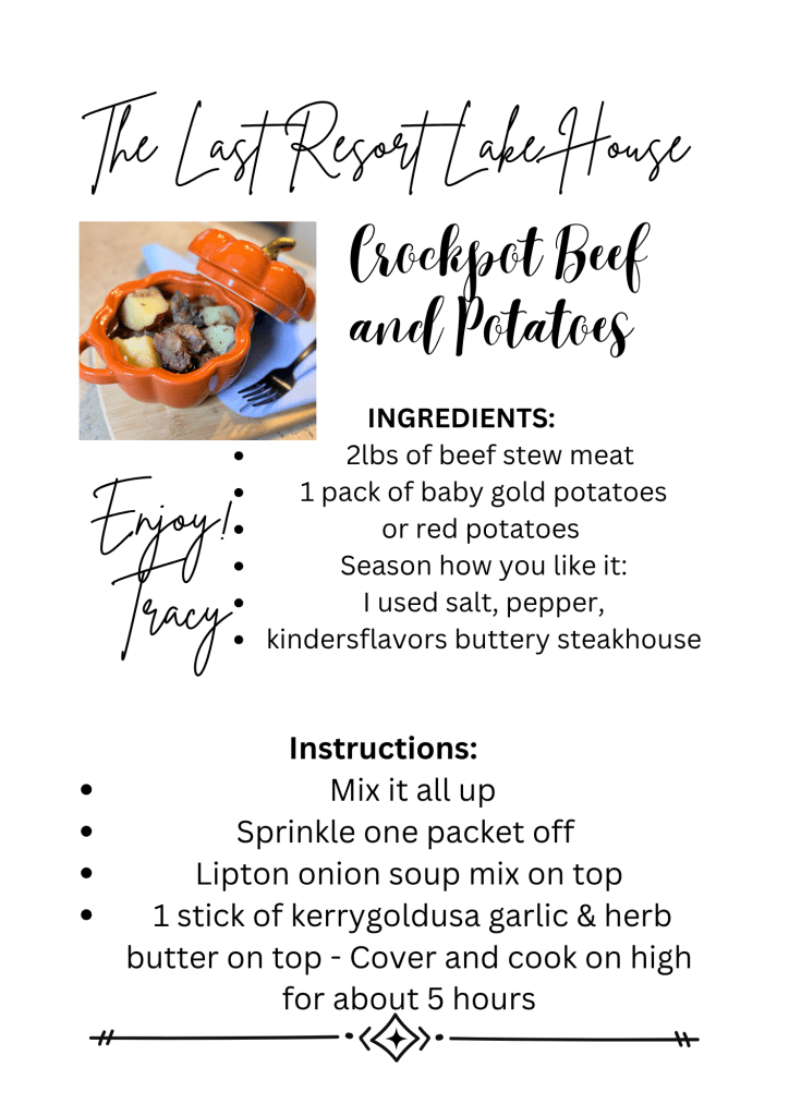 2 lbs beef stew meat 1 pack of baby gold potatoes (washed, halved if large) Seasonings of choice (I used salt, pepper, Kinder’s Buttery Steakhouse, and a little Cajun for kick) 1 packet Lipton onion soup mix 1 stick Kerrygold garlic & herb butter (because butter makes everything better)