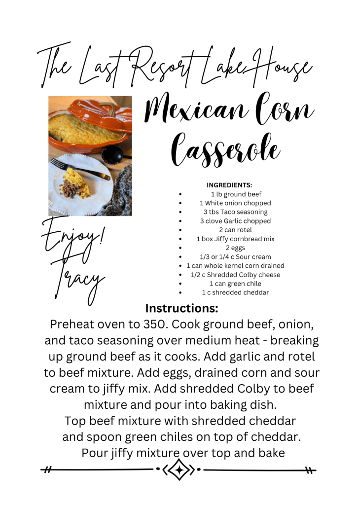 At the end of the day, recipes like this are exactly what I love sharing here at The Last Resort Lake House — simple, flavorful meals that bring people together without all the fuss. This Mexican Corn Casserole is an easy Mexican dinner that fits every kind of night: lazy Tuesday, family Friday, or a cozy weekend by the lake.