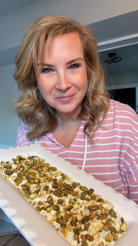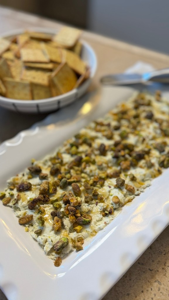 Creamy herb Boursin cheese (aka the easiest gourmet shortcut ever invented) Crunchy salted pistachios (texture heaven) Drizzled hot honey (sweet heat that tastes like you know what you’re doing)